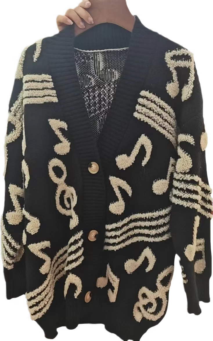 音符柄がかわいいニットカーデ、とってもおしゃれ。