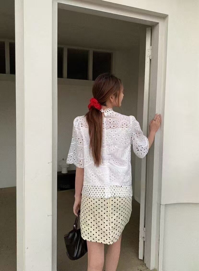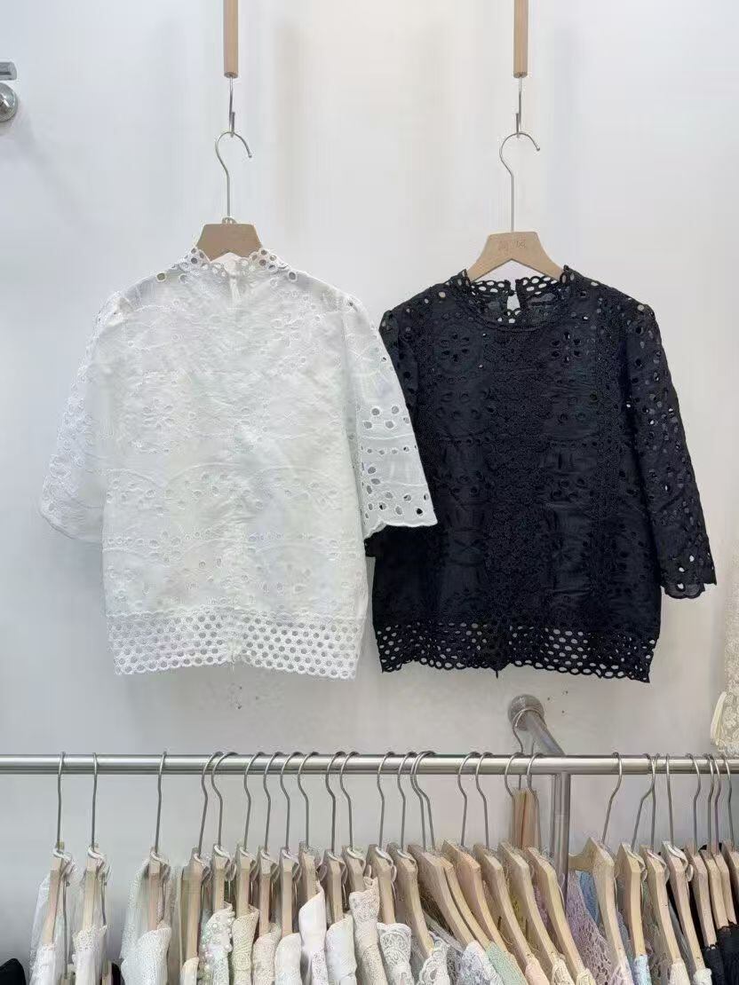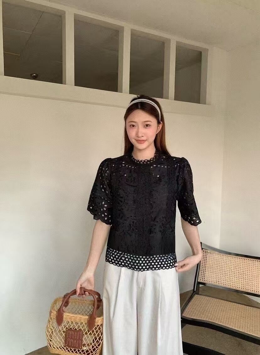 透け感のある穴あきデザインが特徴のレースブラウス、とってもおしゃれ。これからの季節にぴったりです。