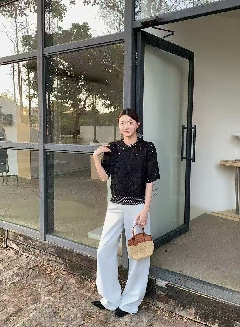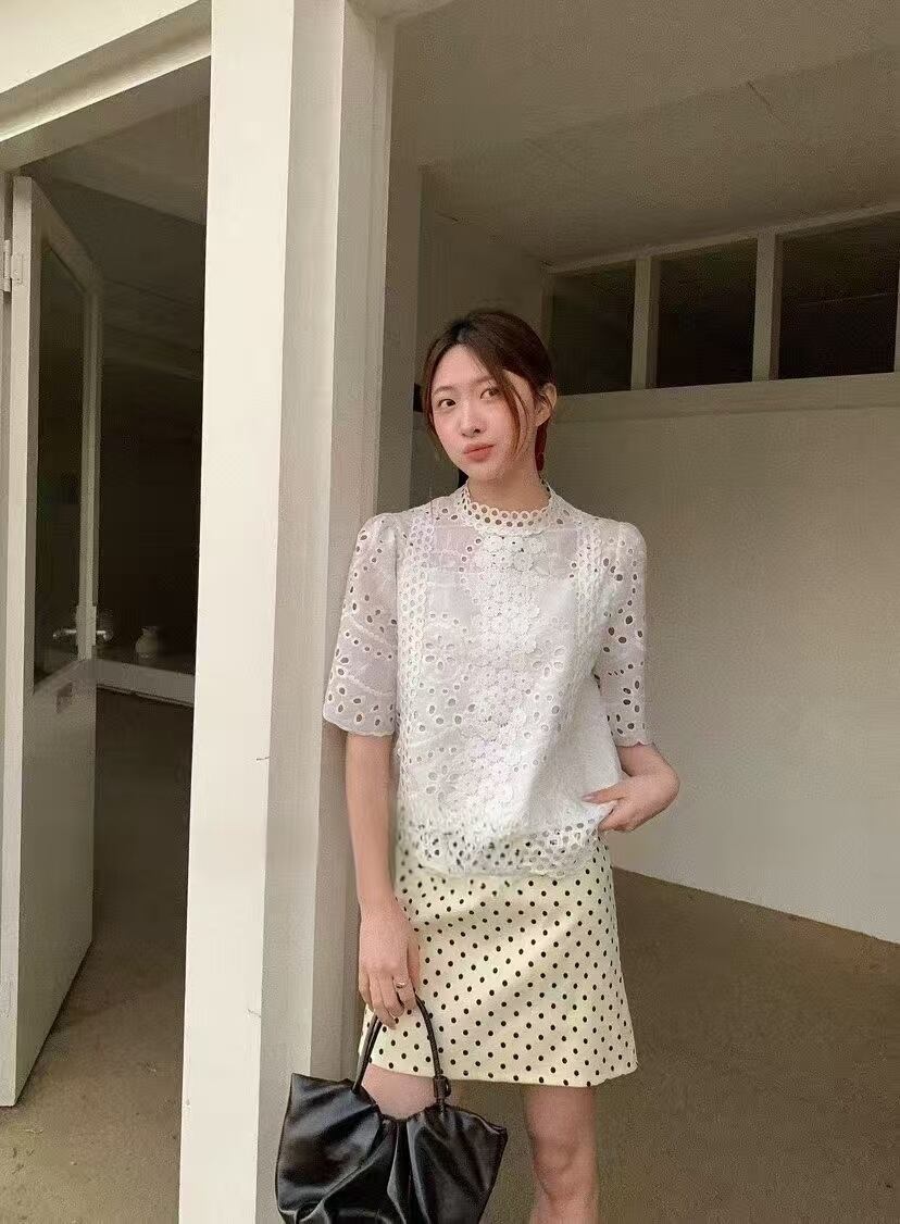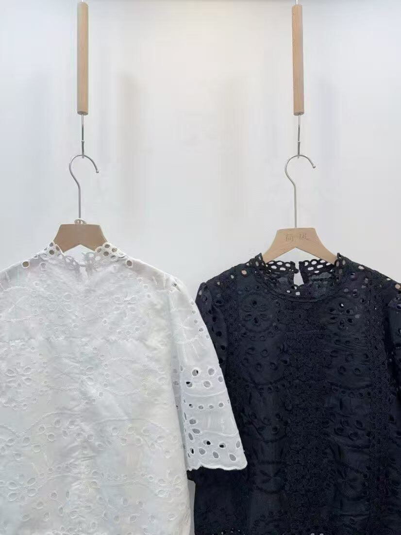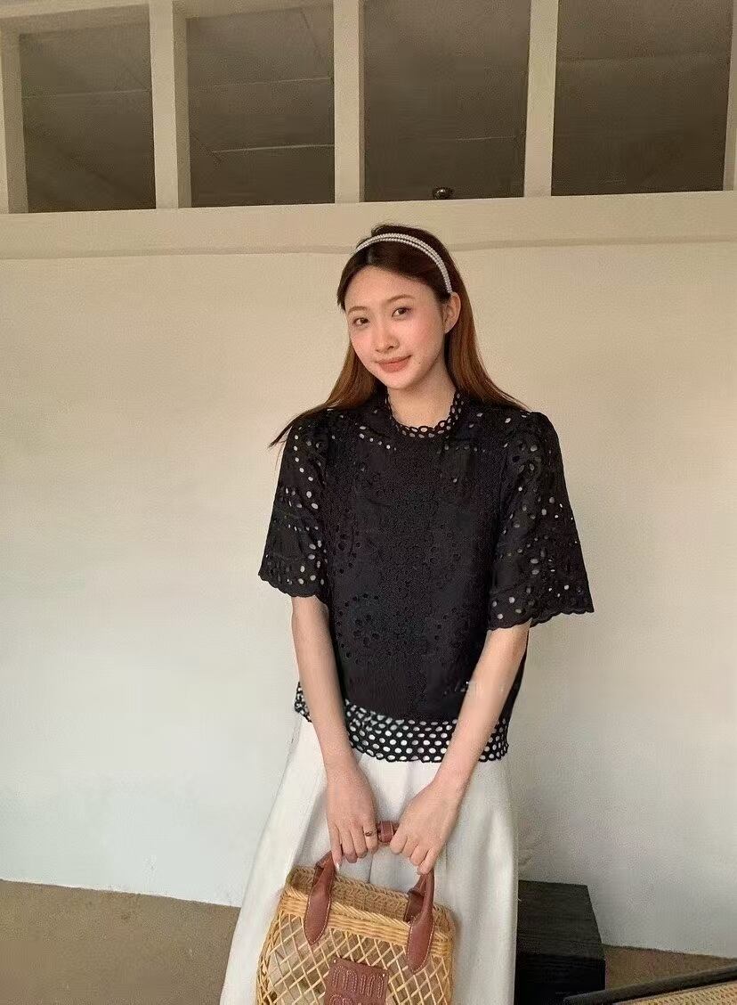 透け感のある穴あきデザインが特徴のレースブラウス、とってもおしゃれ。これからの季節にぴったりです。