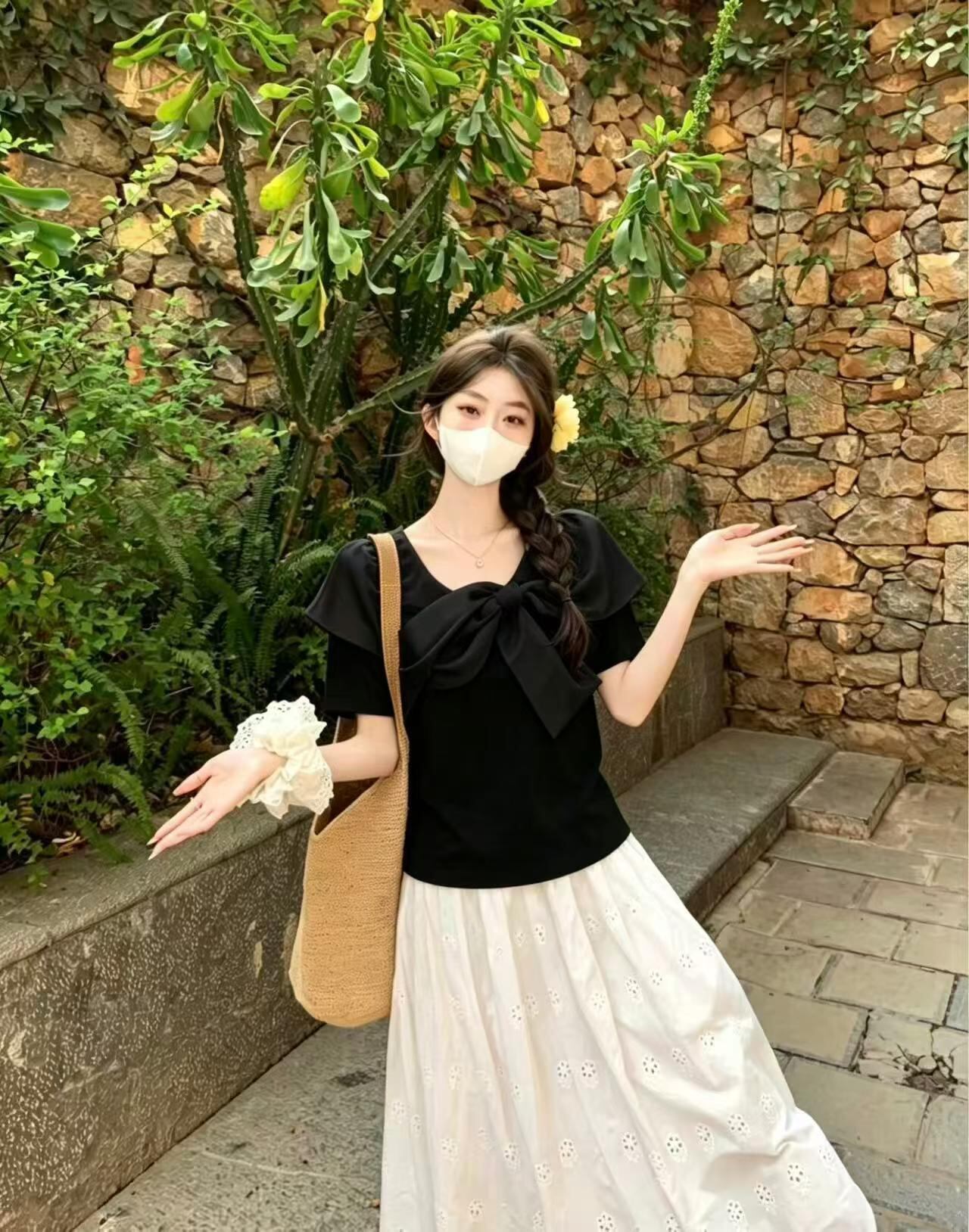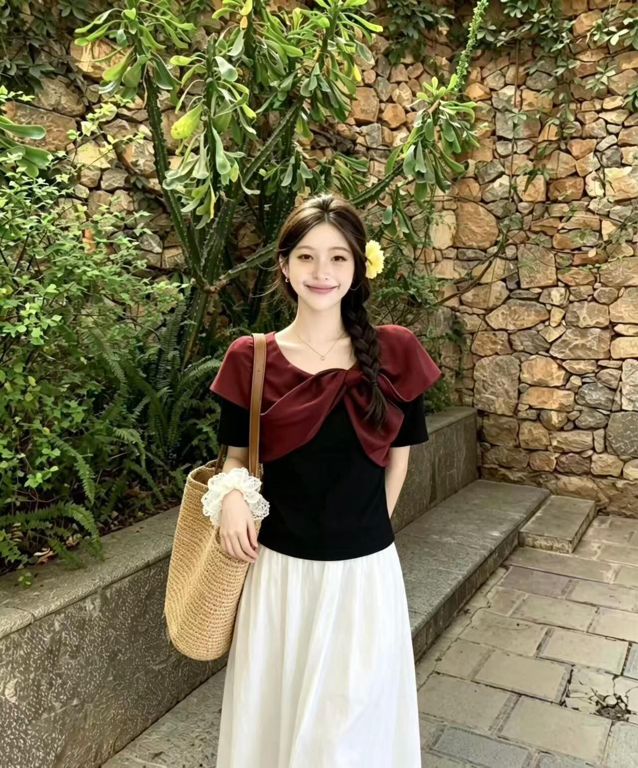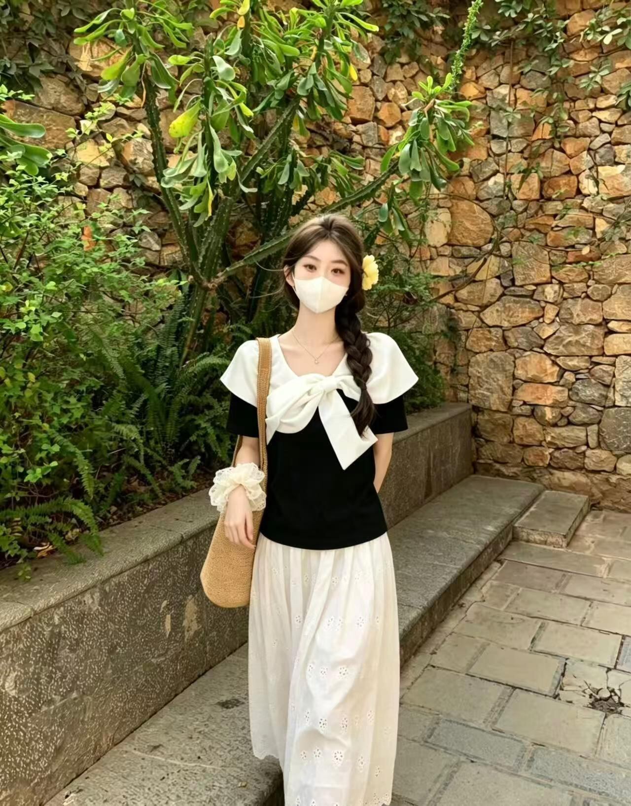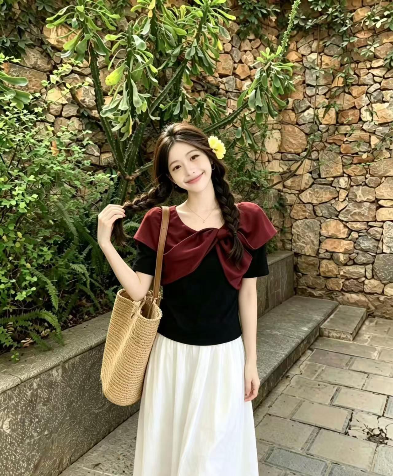 可愛らしい襟元のリボンデザインが特徴のTシャツ、とっても魅力的です!デイリースタイルやカジュアルなお出かけにぴったりな一着です。