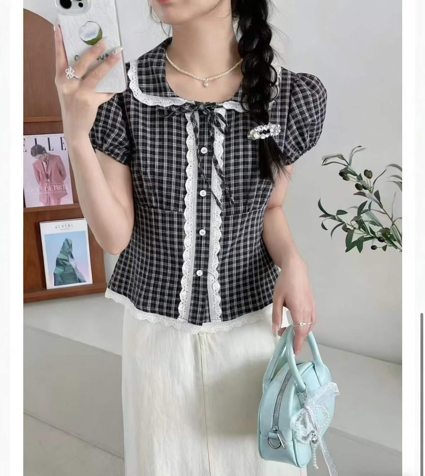 【かわいい】フレンチチェック パフスリーブブラウス